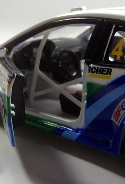 The top of the car is lacking the fine details you would find in a high end collector car but would make a fine addition to any slot car diorama you might own. The roll bars and interior of the car is very well done, in fact it would make any young collector gaze for an extended time to insure they took it all in. The doors open and close smoothly and cleanly with little wobble or play. The door jam painting is a bit askew and lacking the true collector finish. I was impressed by the gauge cluster, how readable it was, for such an inexpensive car that is an outstanding feature. The paint and interior are the strong points for this car, the undercarriages lack of detail is the week point.