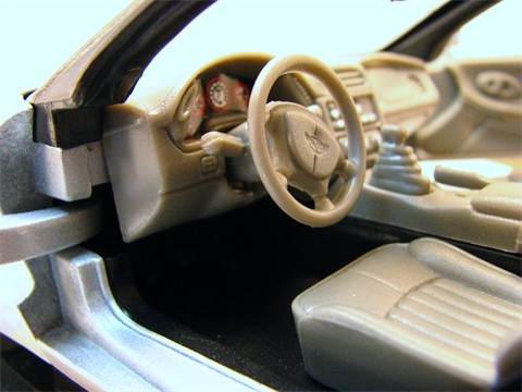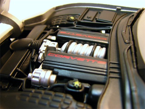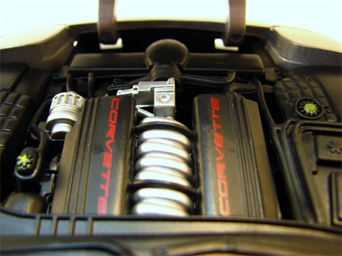The motor in this car does not contain a lot of detail and is the standrd fair as far as the new Corvettes are concerned. It has the signature Corvette intake covers with the spiral view of the top of the motor. The designers did includes the alternator and a few houses but for the most part this is not the