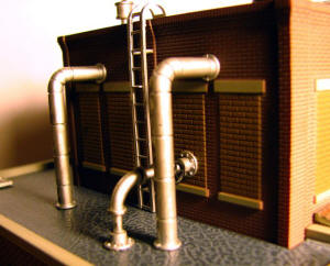First glance shows a very realistic structure but further investigation reveals many details that are overlooked on most models such as the wooden water tank on the roof, complete with a ladder, an air conditioner unit complete with piping also three detailed vents. In addition there is what appears to be an access hatch cover and a smoke stack. There is further access to the roof via a steel ladder from the lower roof. On the lower roof one would find another hatch, and an array of industrial pipes and a dust collector.